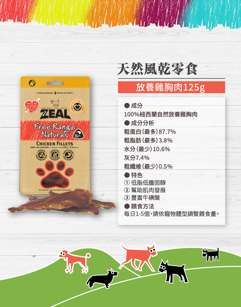 1.  來自紐西蘭放養雞,100%雞胸肉低溫乾燥而成,低脂高蛋白,幫助肌肉發展。