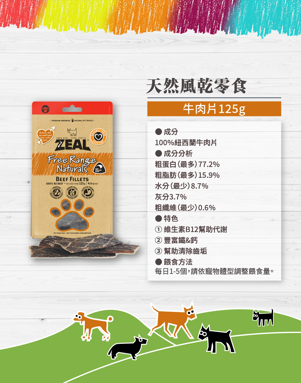 1. 來自紐西蘭野生放牧牛,100%牛肉低溫乾燥而成,含豐富鐵&鈣。啃食時幫助清除齒垢。