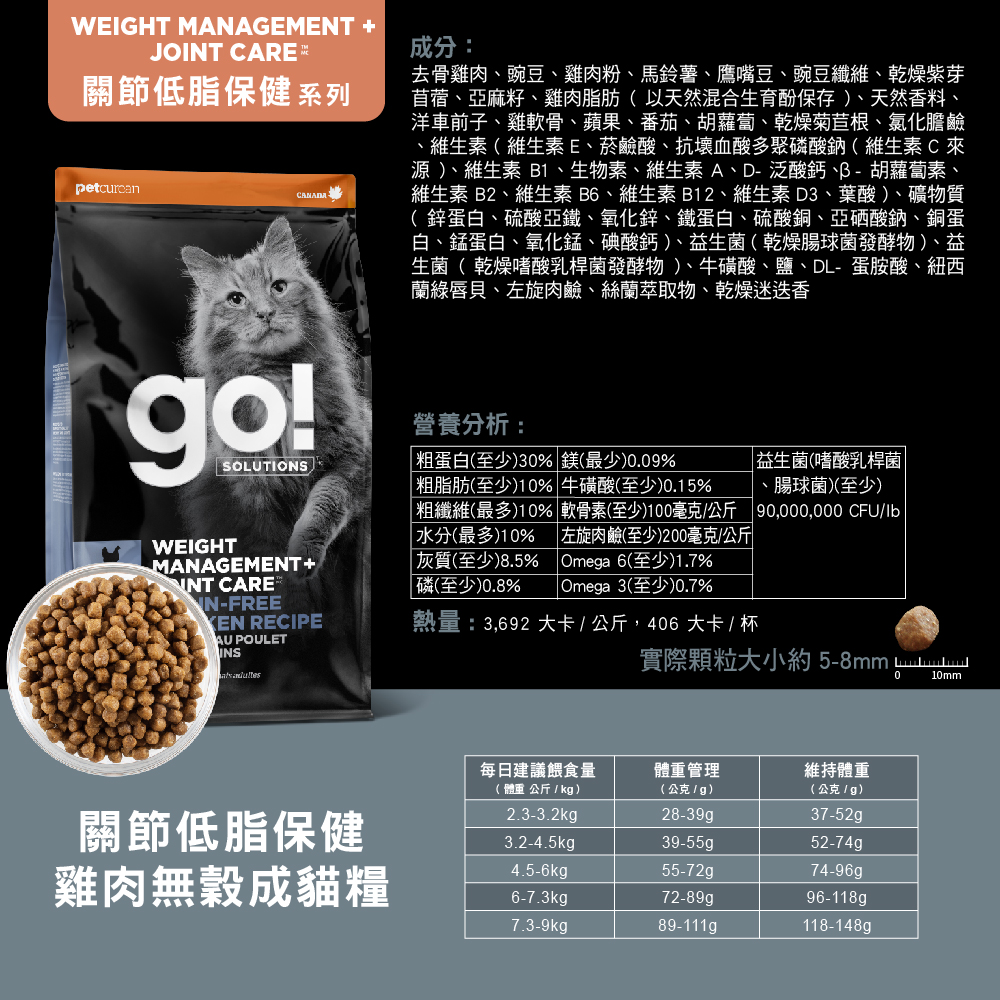 【go】加拿大貓飼料-機能保健系列-關節低脂-雞肉無穀成貓糧 8B (3.63kg)