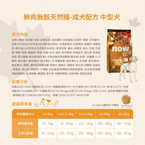 【now】狗狗 鮮肉無穀-中型成犬糧22B (9.98kg)