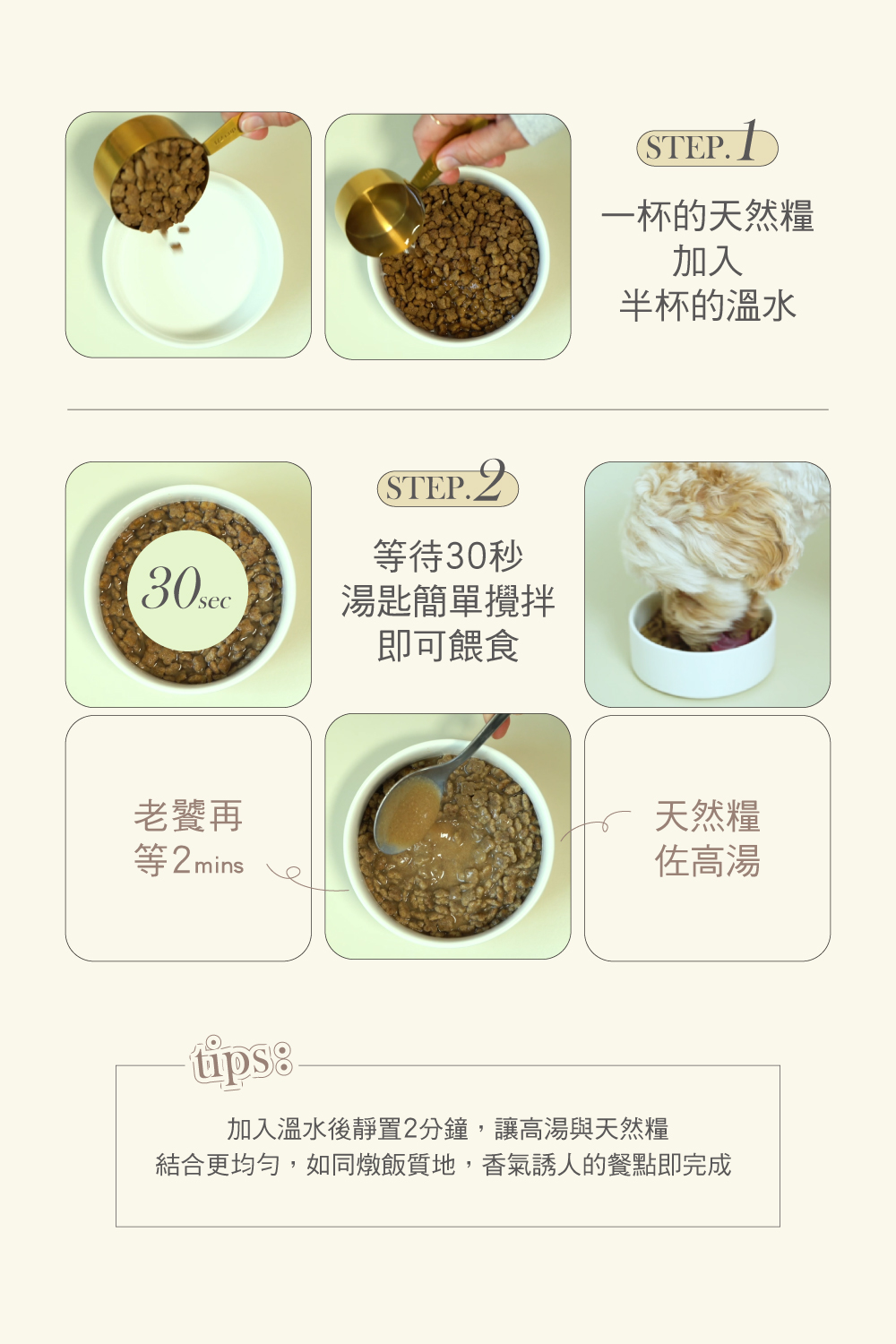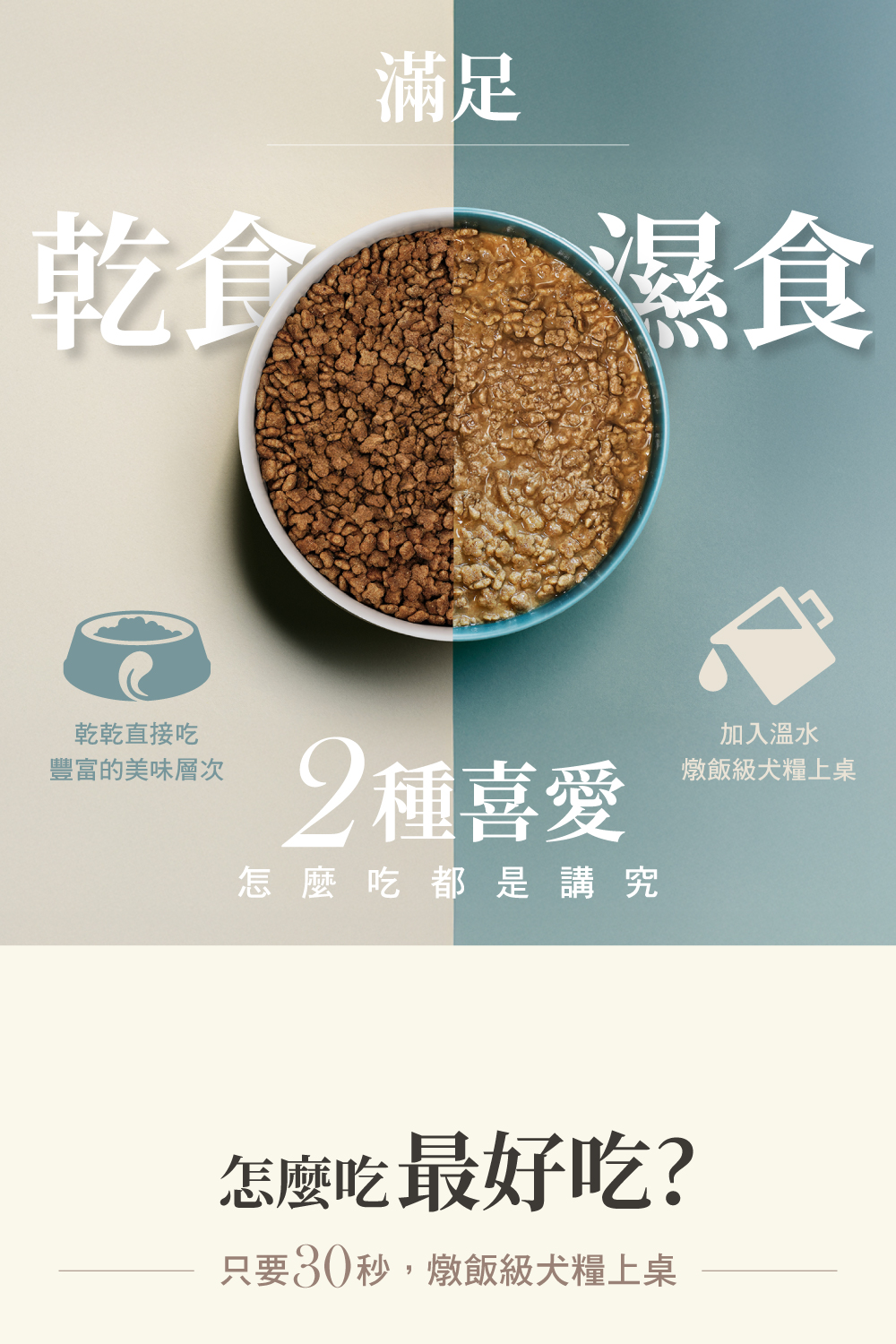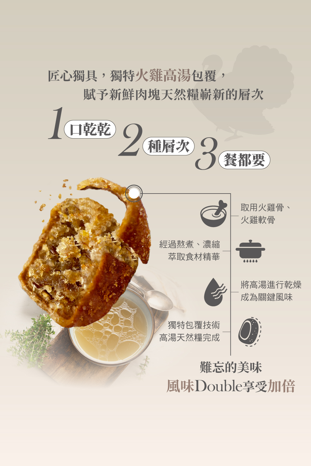 新鮮去骨肉塊製成的犬糧,外層包覆火雞高湯粉,香氣double、美味加分,是挑嘴狗狗最愛的選擇。