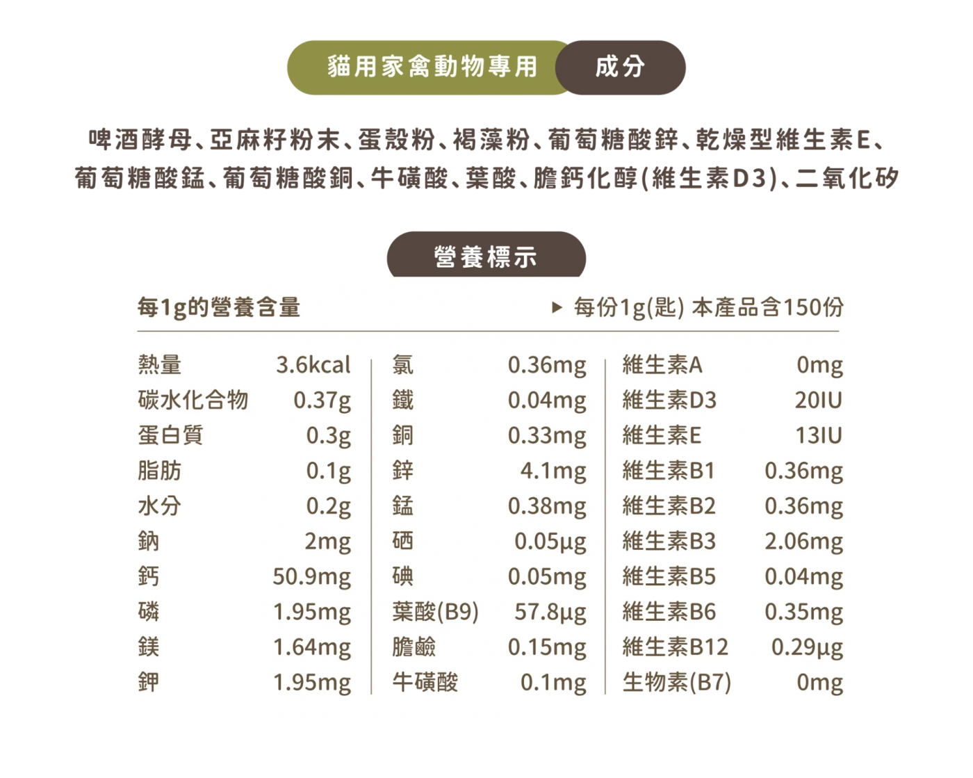 • D3:貓狗對D3有較好的利用率,維持鈣磷平衡、幫助鈣質吸收。
