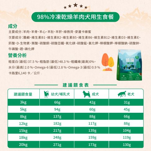 • 98%高含肉量,嚴選紐西蘭新鮮放牧羊肉,豐富肉類蛋白質及胺基酸。