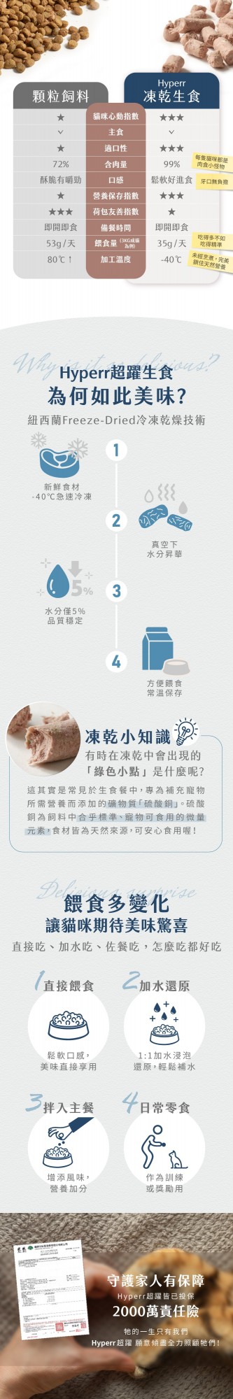 • 冷凍乾燥製成,濃縮4倍鮮肉營養及精華,保留肉絲紋理及天然原肉濃郁香氣。