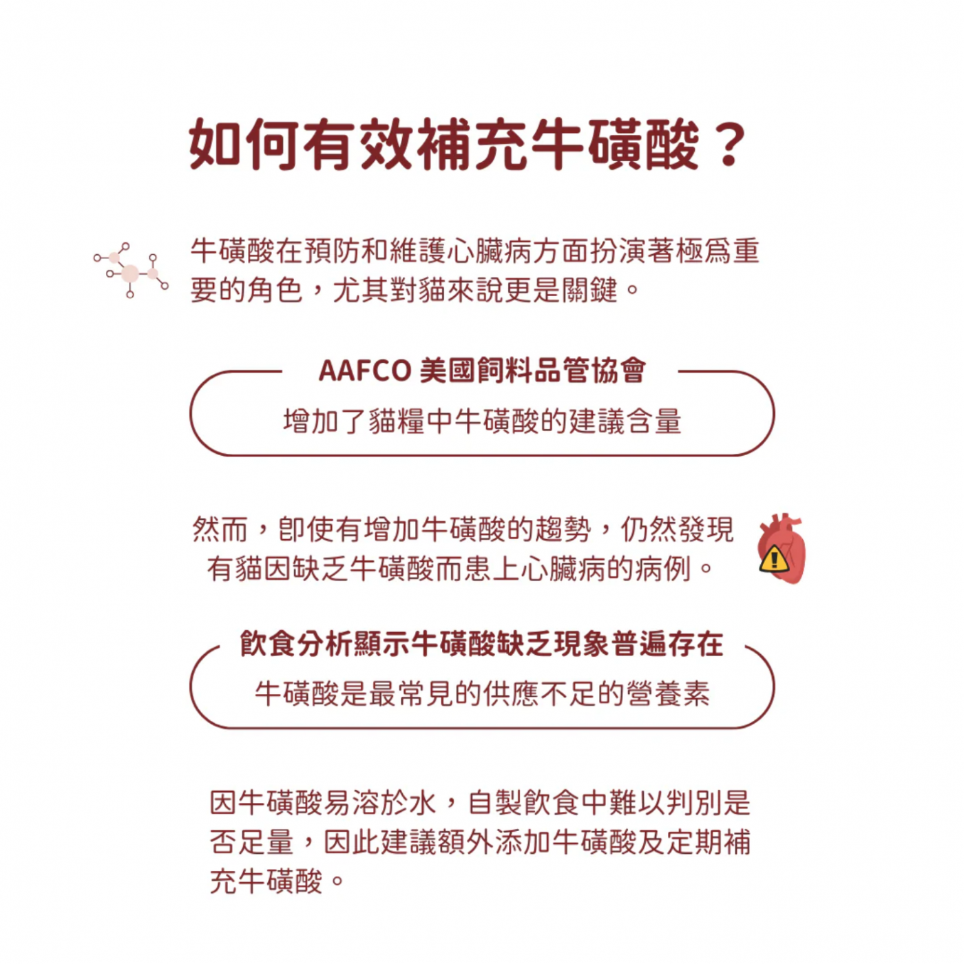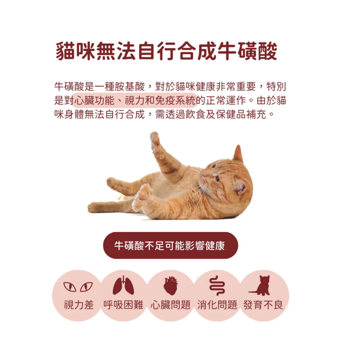 牛磺酸不足會導致貓中央視網膜退化 (FCRD),造成不可逆的視力損害,可能導致失明。此外,根據歐洲食品安全局 (European Food Safety Authority) 2012年的研究指出牛磺酸缺乏與貓咪擴張型心肌病 (DCM) 相關,補充牛磺酸可以幫助預防心臟肌肉疾病並促進復原。因此,牛磺酸可說是貓不可少有的,以及先天性心臟機能不健全的犬貓需要的營養元素。