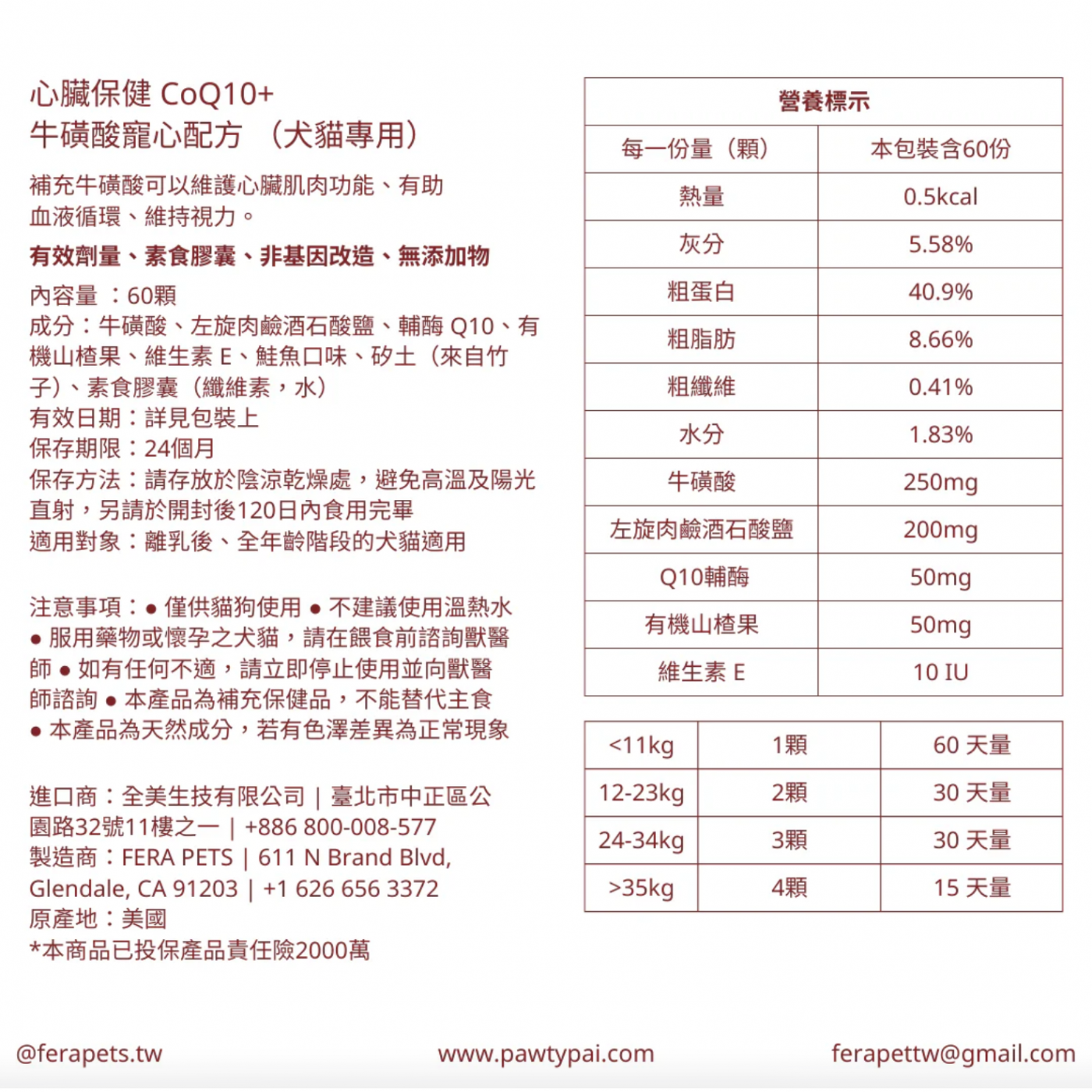 【飛樂沛 Fera Pets】心臟保健 CoQ10+牛磺酸寵心配方 (犬貓專用)60顆