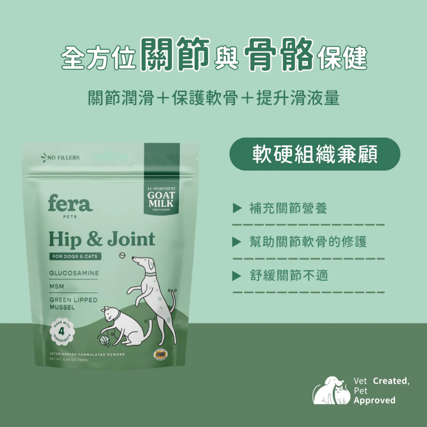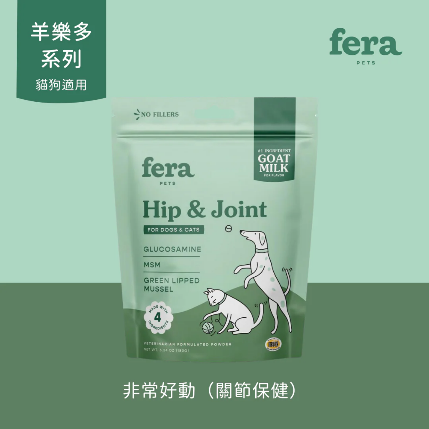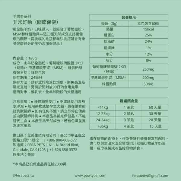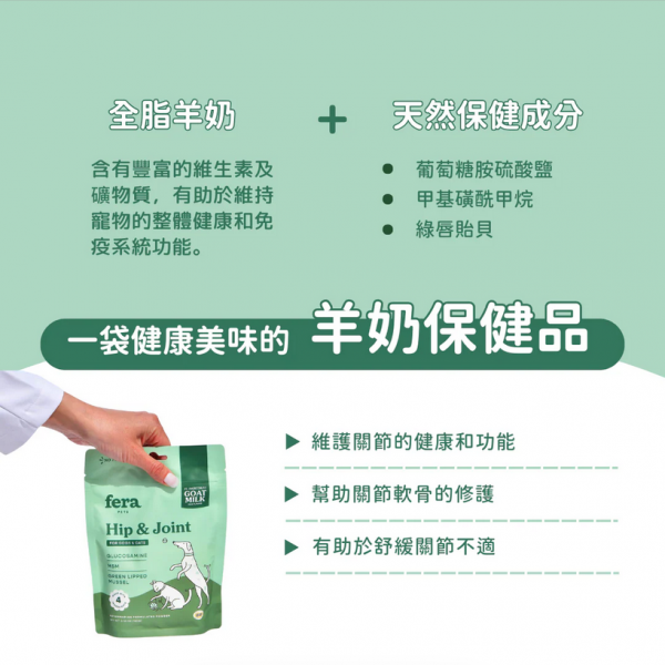 Fera Pets 飛樂沛 羊樂多系列-非常好動關節配方採用山羊奶,口味誘人,並結合了葡萄糖胺、MSM和綠唇貽貝——這三種天然成分旨在支持更健康的關節。再挑嘴的毛孩都無法抗拒著含有衆多健康成分的羊奶添加保健品!