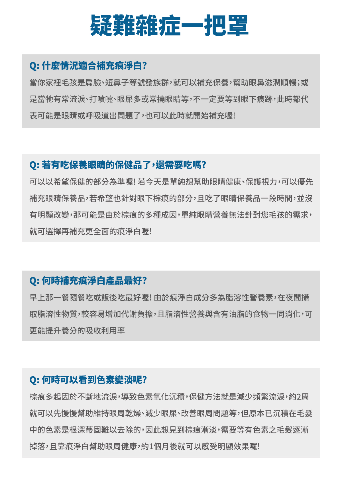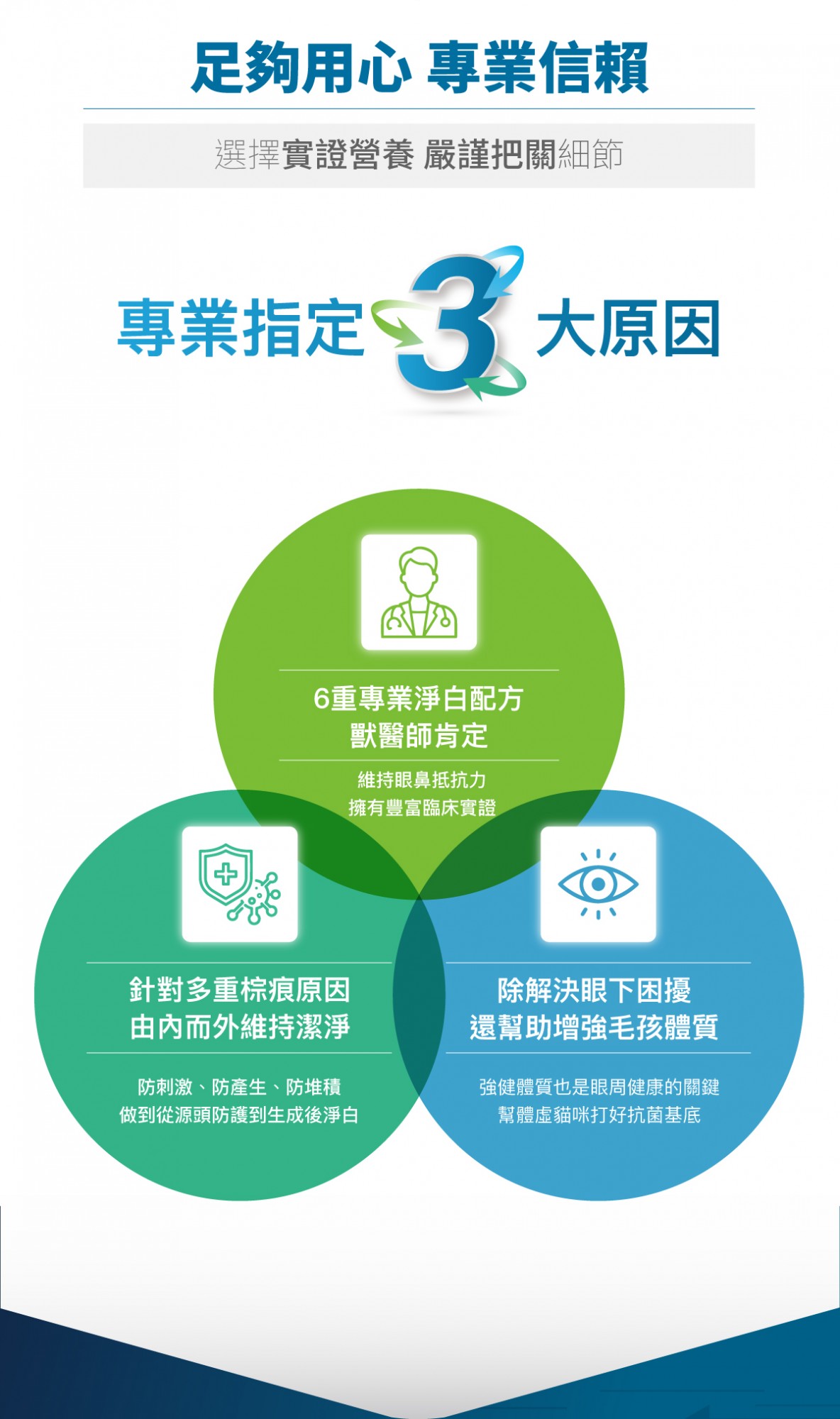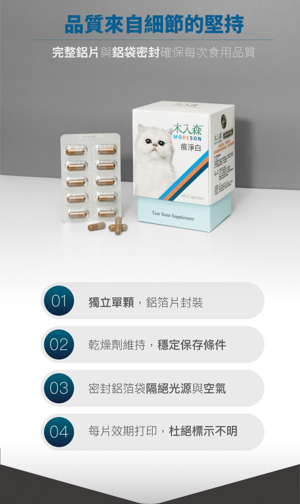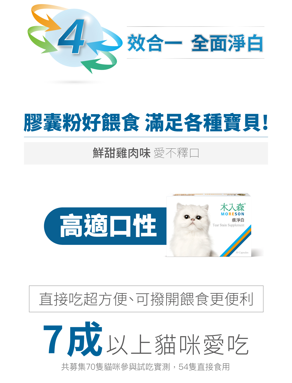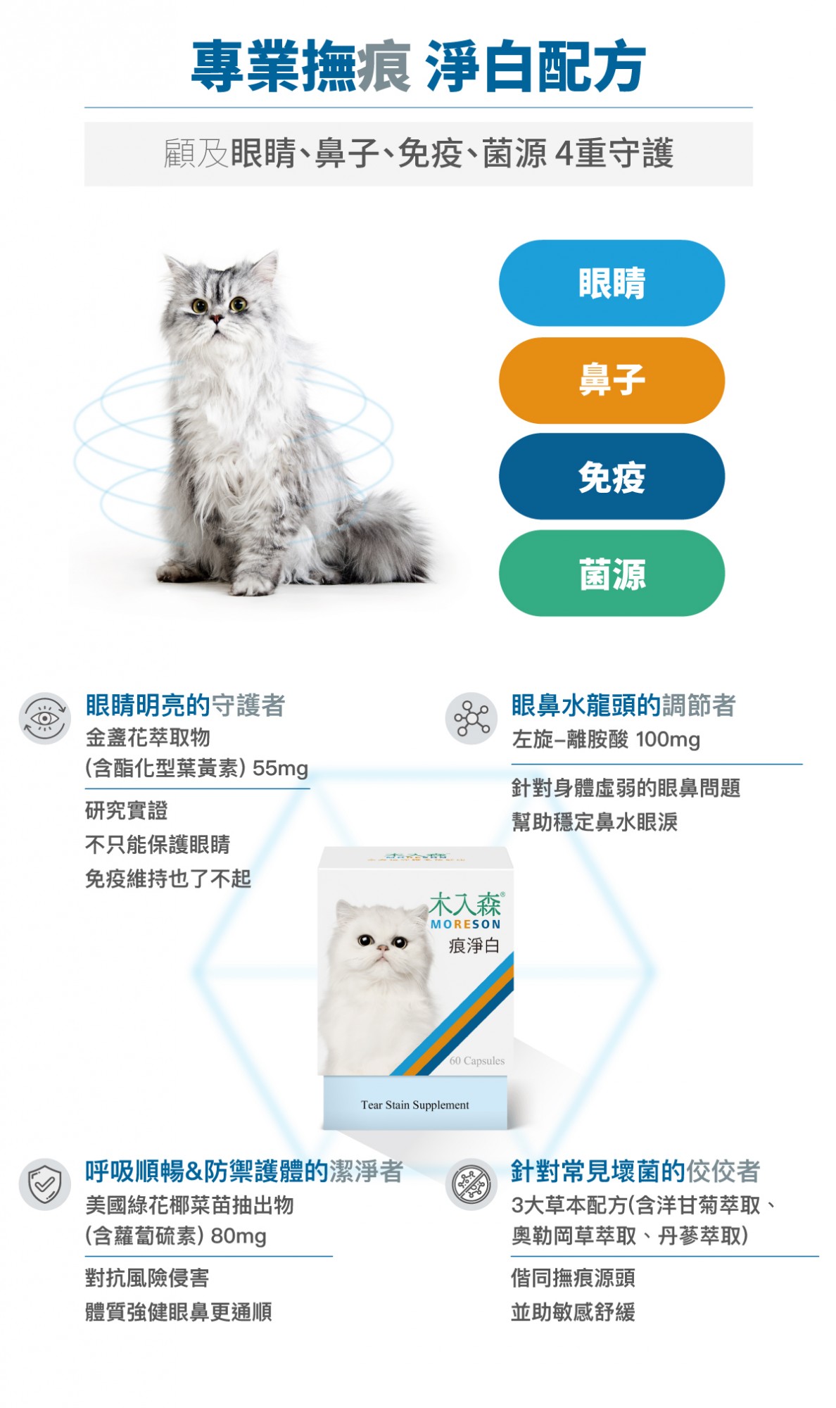 木入森 貓咪痕淨白,全面 4 大淨白營養,對付多重流淚原因,顧及眼睛、鼻子、免疫、菌源 4 重守護,具備強效抗氧化力,化減眼污累積,幫助呼吸順暢並助敏感舒緩。成分據研究證實,可管理色素累積,達到淨白效果。