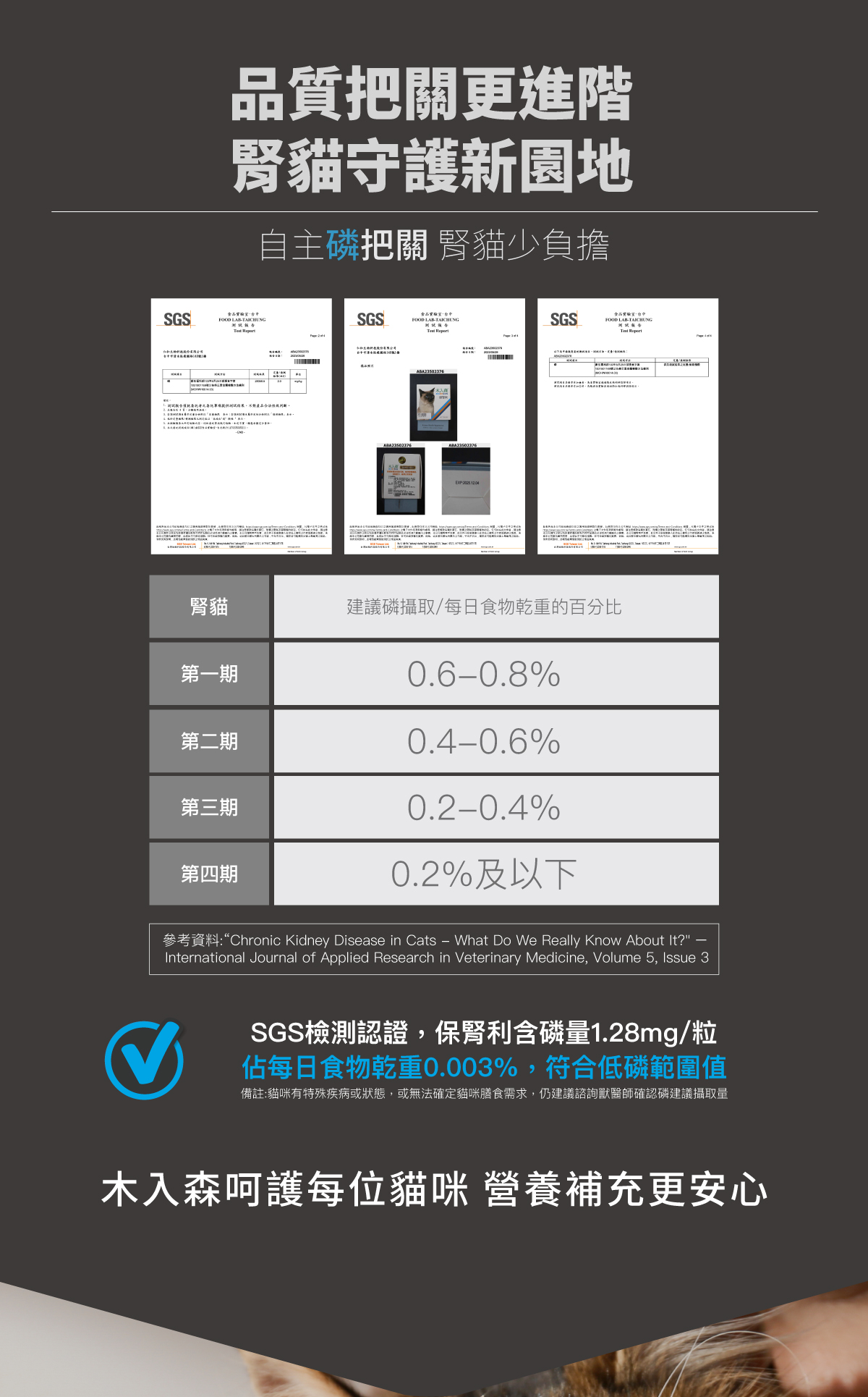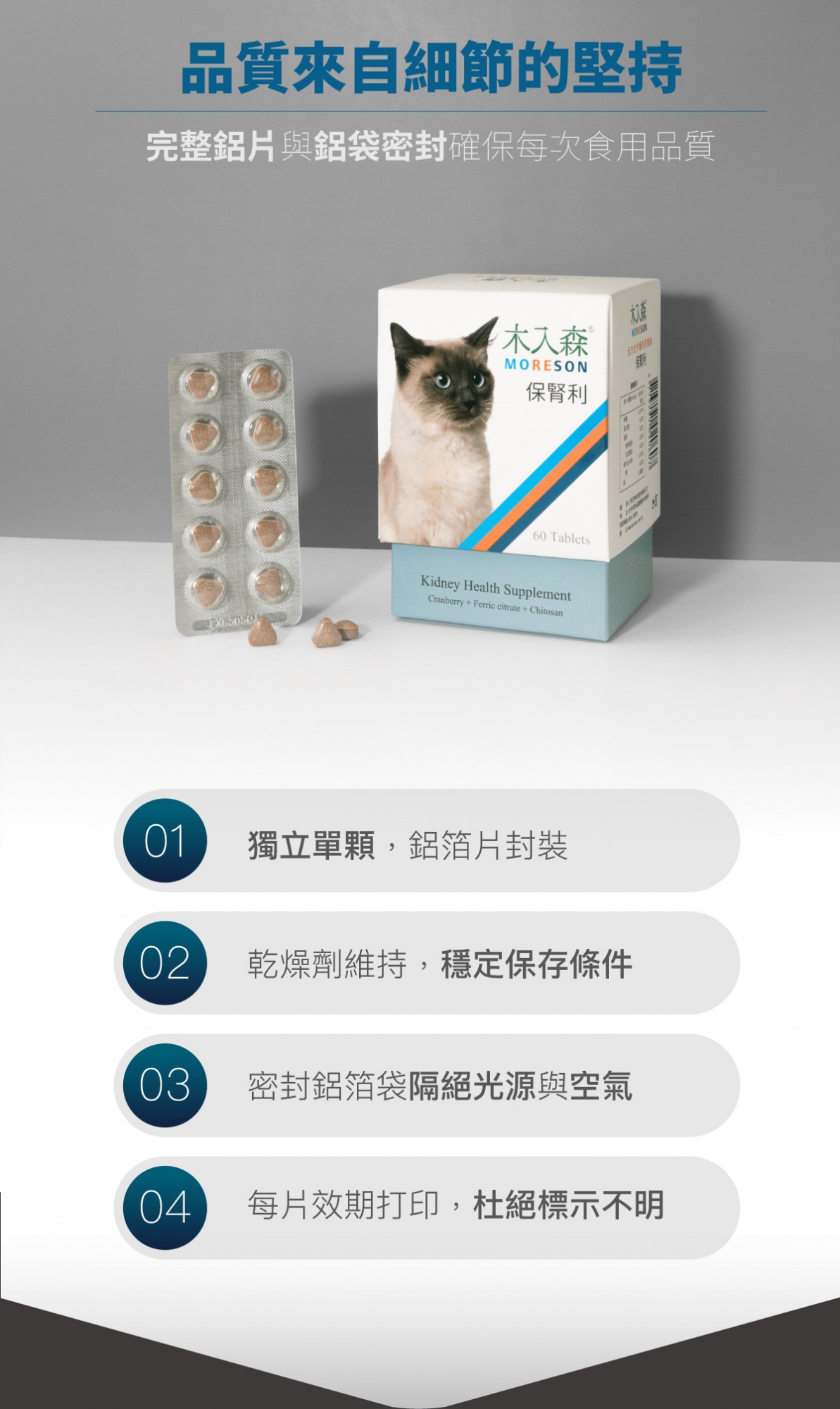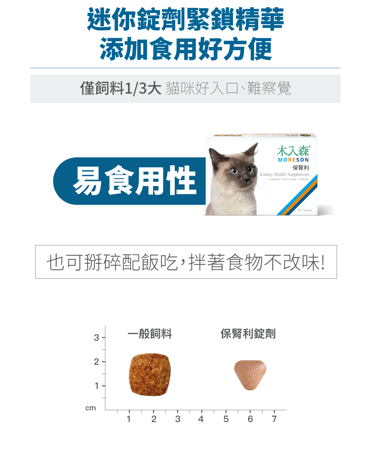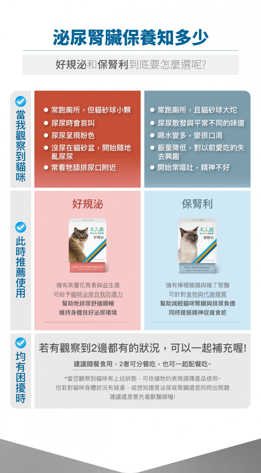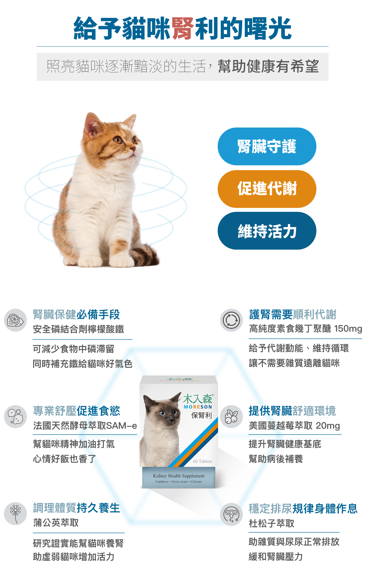貓咪腎臟問題不易檢測,及早觀察很重要!「木入森 貓咪保腎利」,全方位腎臟保健,平日補充可「幫助維持健康腎臟機能」,若遇到貓咪排尿不順或有食慾變差的狀況時,也適合作為「腎臟護理的營養」。