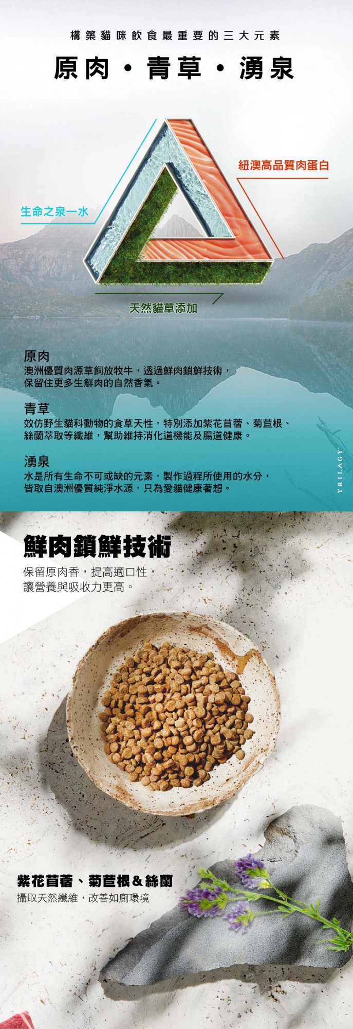 效仿野生貓咪食草特性,紫花苜蓿、菊苣根、絲蘭,幫助室內貓排毛