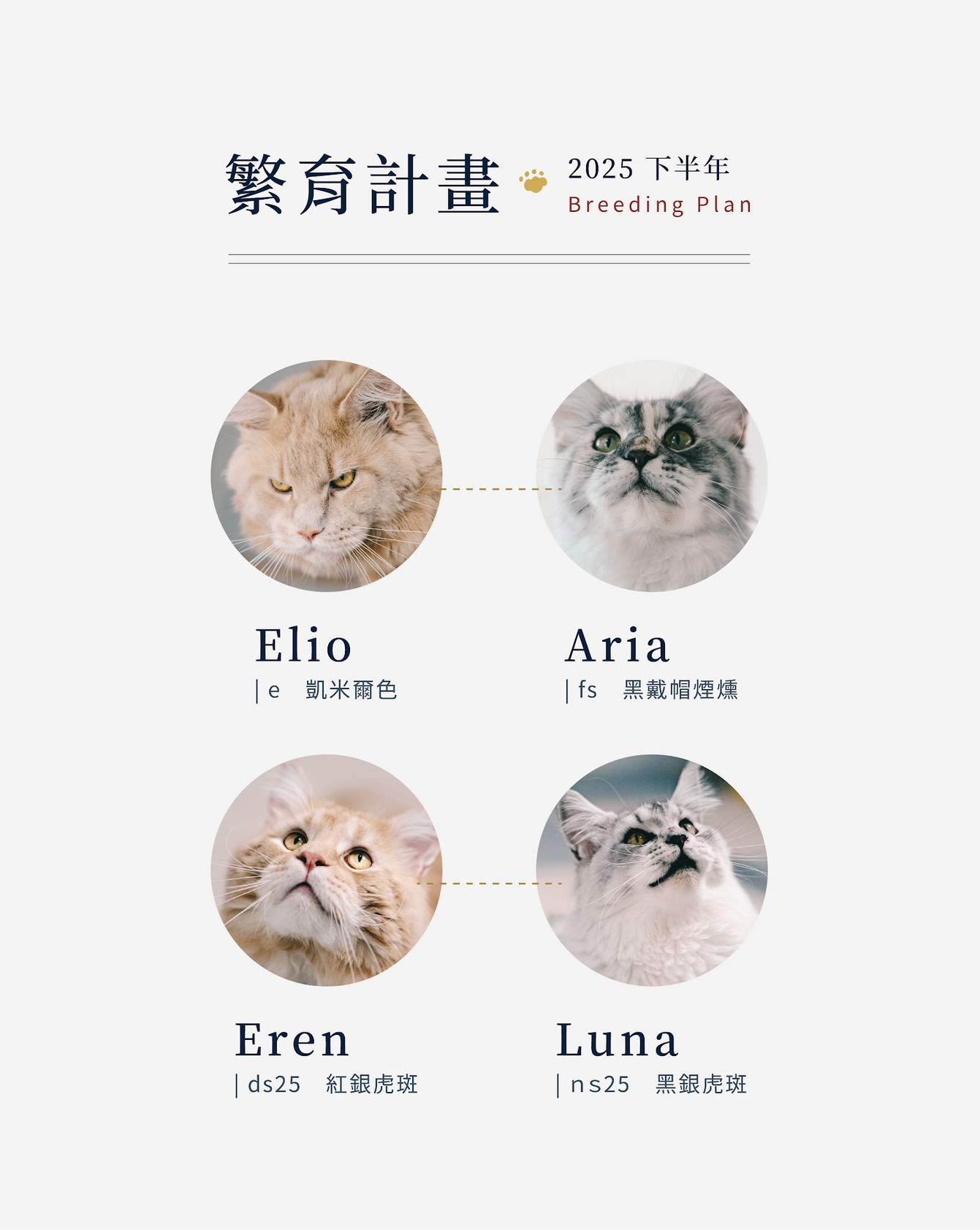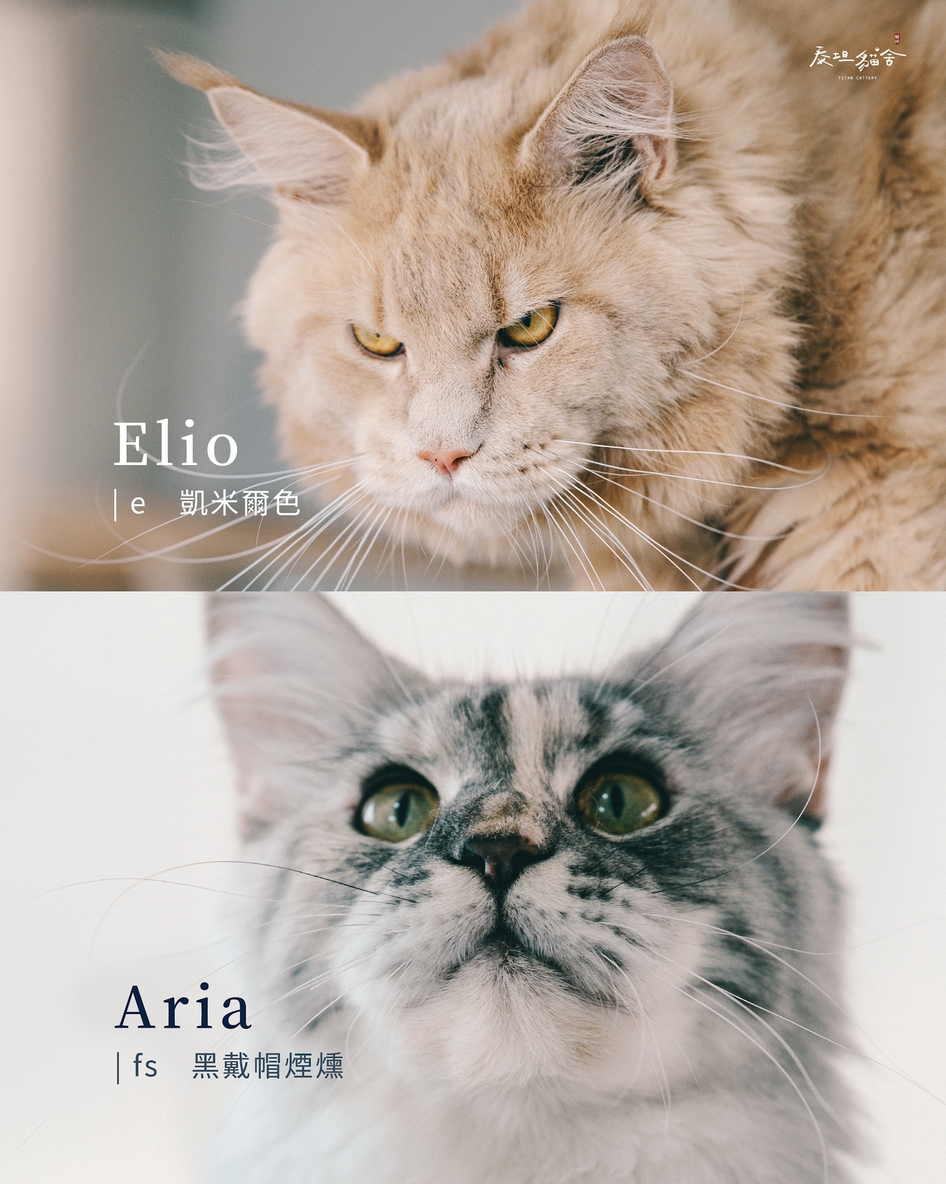 本次繁育組合由擁有溫暖凱米爾色(Cream)的公貓 ELIO 與氣質柔和的黑玳瑁煙燻母貓 ARIA 所構成,目標為育出兼具穩定性格與大毛量的理想家庭型緬因貓。ELIO 承襲自歐洲名門 Summerplace 系譜,血緣中包含傳奇種公 Summerplace Achat,以優秀骨架與穩定遺傳聞名。雖非冠軍系直系後代,卻展現出完美比例、紮實結構與溫馴親人的特質,是極具潛力的 Cream 系公貓代表。