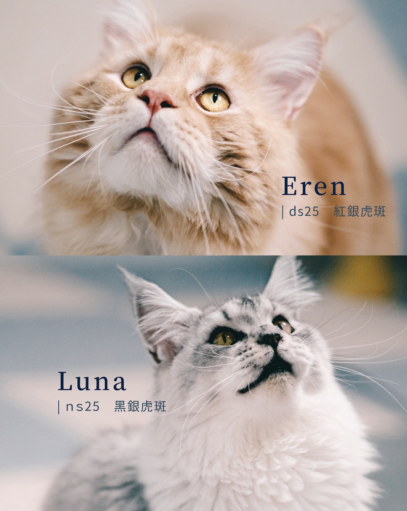 本次繁育組合由 TITAN Cattery 代表種公 EREN 與高銀系母貓 LUNA 所構成,結合了世界冠軍血統與極稀有的銀色基因。EREN 具備五代內三次 WCH 血統,外型比例完美、性格親人溫順,並通過全項基因檢測(n/n)與髖關節 HS0 認證,體現 TITAN 對健康與結構的極致要求。LUNA 則以罕見的高銀 ns25 毛色與q媲美公貓的骨架著稱,兼具野性光澤與優雅氣質,為當代緬因貓銀色系中少見的優秀種母。小孩有望繼承兩者大體型的優勢。